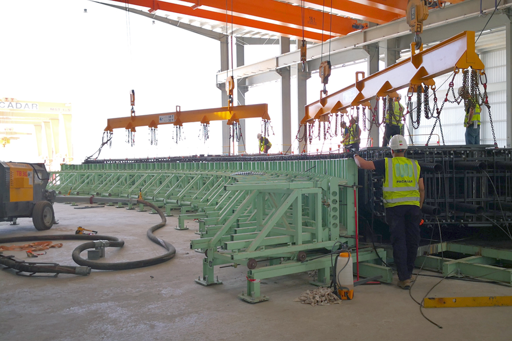 - The large number of precast roof panels vary in curvature, and a special system utilising pistons help raise the formwork for achieving the required curvature.