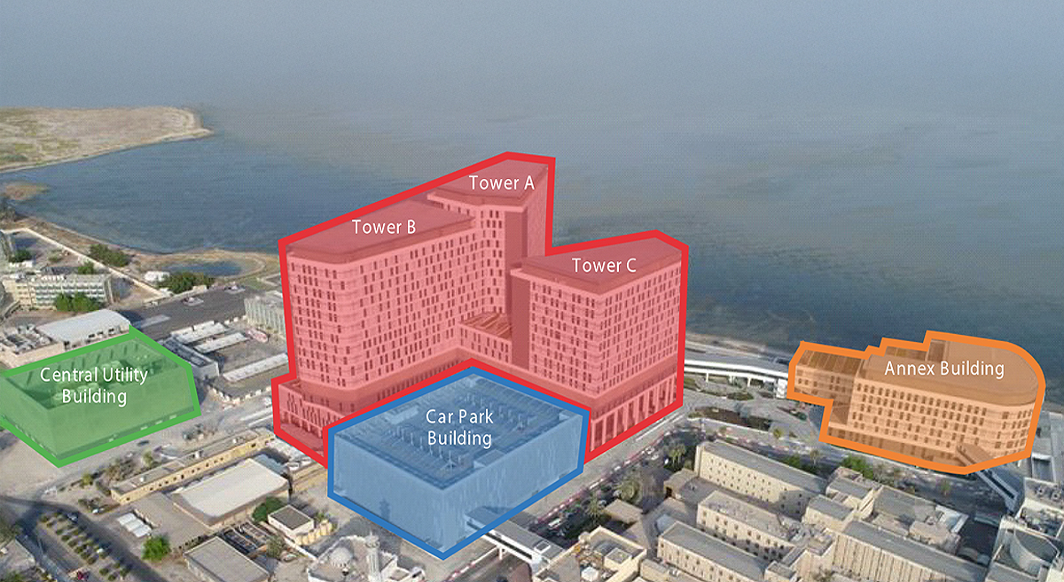 The huge complex comprises four main buildings, each dedicated to a unique purpose: The Main Hospital; an Annex Building; car park structure; and a large central utility plant. The central component is the main hospital building which comprises three in-patient towers that are placed above a 6-floor diagnostic and treatment podium.
